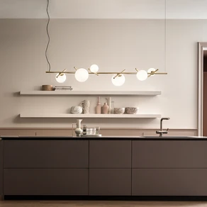 Hanglampen worden zo opgehangen dat je de persoon tegenover je volledig kunt zien en tegelijkertijd is er geen risico dat je je hoofd stoot als je opstaat. Dit betekent dat er een afstand van 80 tot 100 cm moet zijn tussen de onderrand van de gouden hanglamp en het tafelblad.