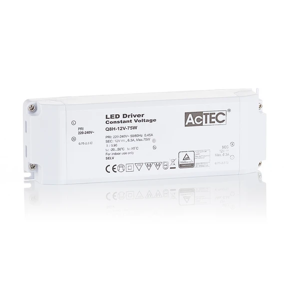 Constante spanning LED driver Q8H 12V 75W, niet-dimbaar - compact ontwerp - SELV isolatie - IP20 - bescherming tegen kortsluiting, open circuit, oververhitting en overbelasting - 220-240V, 50-60Hz - minimale belasting 0,5 W - omgevingstemperatuur -20 tot 50° C