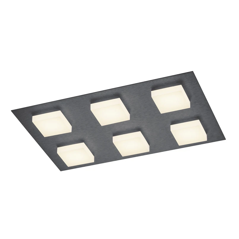 Moderne LED plafondlamp Luno met zes lichtvierkanten - te bedienen met de meegeleverde Link afstandsbediening Met zijn eigentijdse design, functionaliteit en lichttechniek is de 6-lamps plafondlamp Luno de perfecte keuze voor moderne woonruimtes. Luno wordt door BANKAMP in zijn Duitse productievestiging in uitstekende kwaliteit vervaardigd, waarbij een rechthoekige plafondplaat van geanodiseerd aluminium de basis vormt. Hierop zijn zes vierkante, opalen acryl diffusers geplaatst in twee rijen van drie, die zorgen voor een gelijkmatige algemene verlichting. Die geïntegreerde LED's stralen warmwit licht uit; de lichttemperatuur neemt af bij het dimmen (dimmen) zodat ook een bijzonder warme en zachte verlichting kan worden bereikt. Een Link afstandsbediening is bij de levering inbegrepen, die kan worden gebruikt als een Mobile bedieningseenheid of een stationaire wanddimmer. Das maakt schakelen door drukken en dimmen door draaien mogelijk. Als meerdere B-Leuchten samen moeten worden aangestuurd, kunnen er maximaal tien aan één afstandsbediening worden gekoppeld - Zeer goede kleurweergave: Cri Cri > 90 - Niet geschikt voor gebruik met andere dimmers - Reikwijdte afstandsbediening: MAX. 10 m