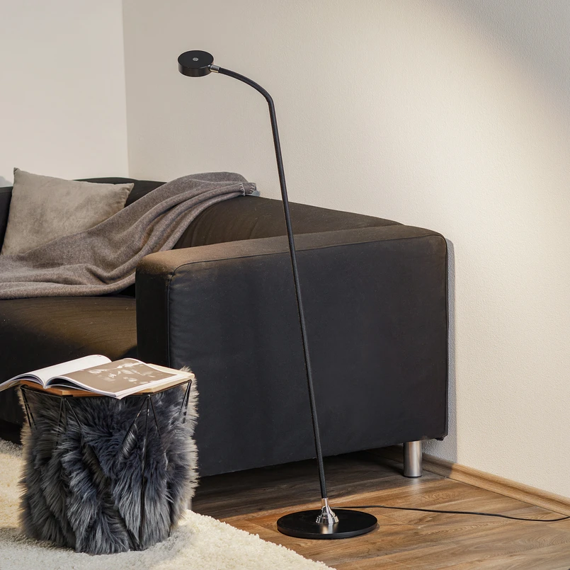 Flexibele zwenkbare LED vloerlamp 24.107 met touchdimmer Die LED vloerlamp 24.107 is een combinatie van energiezuinige LED technologie, flexibele constructie en een Modieuze look. Ze verbindt de ronde metalen voet met de even ronde reflectorkop door middel van een flexibele arm bekleed met zwart textiel. Deze laatste is verankerd in een kogelgewricht in de voet en biedt een hoge bewegingsflexibiliteit. De reflectorkop kan ook worden gedraaid zodat de armatuur gericht kan worden en Ideal lichtrichting mogelijk maakt. De ingebouwde LED lamp spot warmwit licht en kan met de geïntegreerde touchdimmer worden geschakeld en de lichtopbrengst worden geregeld. Baulmann Leuchten is een armaturenfabrikant uit het Duitse Sauerland met als doel Die mensen en hun welzijn positief te verrijken met licht. Baulmann realiseert deze Vision in haar assortiment van armaturen en in concepten die individueel op verzoek van de klant zijn ontwikkeld.