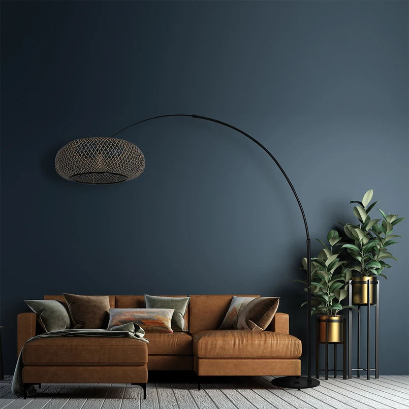Boogvormige vloerlamp Sparkled Light met kap van vlechtwerk Deze aantrekkelijke boogvormige vloerlamp kan worden gebruikt om elke woonruimte op een functionele en aangename manier te verlichten. Sparkled Light is uitgerust met een zwart gelakt metalen frame dat zowel in hoogte als in de projectie kan worden aangepast aan de individuele omstandigheden. De kap is gemaakt van een fijn houten gaas, waardoor het licht van de lamp niet alleen naar beneden straalt, maar door het gaas naar alle kanten straalt.