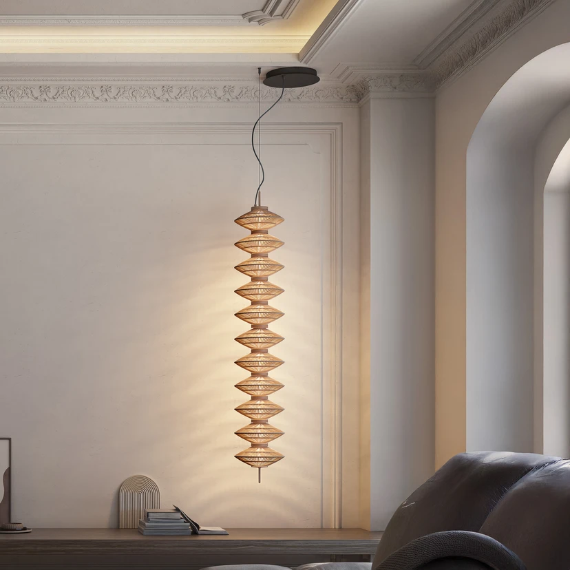 De LED hanglamp Yuyun S/11L van Bover is een ontwerp van Joana Bover en is ontstaan uit de behoefte om verticale verlichtingselementen te creëren die ruimtes met een sterk esthetisch effect verlichten en bijzonder geschikt zijn voor hoge ruimtes of hoeken. De elf boven elkaar geplaatste, handgemaakte kappen, afgewerkt met beige katoenen draden, vormen een indrukwekkende lamp die geschikt is voor hoge ruimtes zoals trappenhuizen, galerijen enz. en in elke ruimte een blikvanger is. Met een bijzonder warmwitte lichtkleur zorgt de lamp voor een aangename en gezellige sfeer.