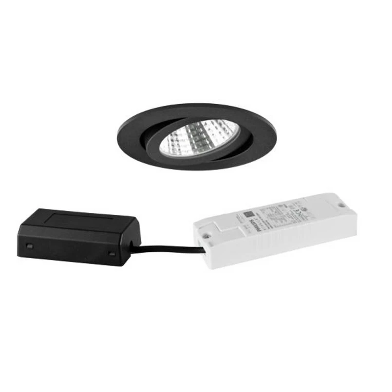 LED inbouwspot BB03 met DALI-dimbare driver en aansluitdoos Deze ronde LED inbouwspotset bestaat uit een spot met een armatuurkop die in alle richtingen 30° kantelbaar is, een DALI-dimbare LED driver en een aansluitdoos. De downlight kan zonder gereedschap worden gemonteerd met behulp van installatieveren. Hij is uitgerust met een zilverkleurige reflector met diepe lichtspreiding en een transparante polycarbonaat afdekking - met elektronische, DALI-2 dimbare voorschakelapparatuur - met aansluitdoos - toelaatbare omgevingstemperatuur -20 tot 25 °C - stralingshoek 38° - max. plafonddikte 1,3 cm - geen afdekking met thermisch isolatiemateriaal