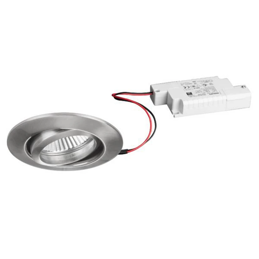 LED inbouwspotset BB13 rond met fase-afsnijdbare dimmer (RC) BB13 is een LED inbouwspotset bestaande uit een ronde LED inbouwspot en een LED driver die dimbaar is via fase-afsnijdbare dimmer (RC). De ronde downlight straalt warm witte verlichting uit onder een hoek van 38°. De lichtkegel kan 25° in de gewenste richting worden gericht dankzij de zwenkbaarheid van de spot. Als de downlight wordt gedimd via een externe fase-afsnijdingsdimmer, verandert de dim-2-warm-functie de lichtkleur. Terwijl bij volle lichtsterkte warmwit licht met een kleurtemperatuur van 3.000 K wordt uitgestraald, daalt de kleurtemperatuur tijdens het dimproces tot 1.800 K bij het laagste dimniveau. - incl. elektronisch voorschakelapparaat, fase-afsnijdingsdimbaar (RC) - zilverkleurige reflector met rotatiesymmetrische, diepe lichtsterkteverdeling - afdekking van transparant glas - geen afdekking met warmte-isolatiemateriaal