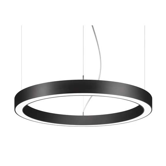Biro Circle Ring LED hanglamp, kaphoogte 10 cm, Ø 75 cm, schakelbaar Een aluminium ring vormt de kap van de Biro Circle Ring LED hanglamp van BRUMBERG, die aan filigrane staalkabels direct aan het plafond hangt en dankzij de nauwelijks zichtbare staalkabels in de ruimte lijkt te zweven. De rondom de ring geïnstalleerde LED's spotten krachtig en optimaal verdeeld licht naar beneden dankzij de rotatiesymmetrische, diep-brede lichtverdeling en een opaalwitte kunststof afdekking. De LED-pendelarmatuur Biro Circe Ring is speciaal ontworpen voor de verlichting van kantoren en vergaderruimten, maar kan ook de eettafel in huis effectief en gelijkmatig verlichten - algemene kleurweergave-index CRI > 80 - levensduur L70/B50 bij 25 °C: 276.000 uur, levensduur L80/B20 bij 25 °C: 153.000 uur - behuizingsmateriaal: aluminium / staal / kunststof - toelaatbare omgevingstemperatuur (ta): -20 °C - +25 °C - met elektronisch voorschakelapparaat, schakelbaar, niet dimbaar