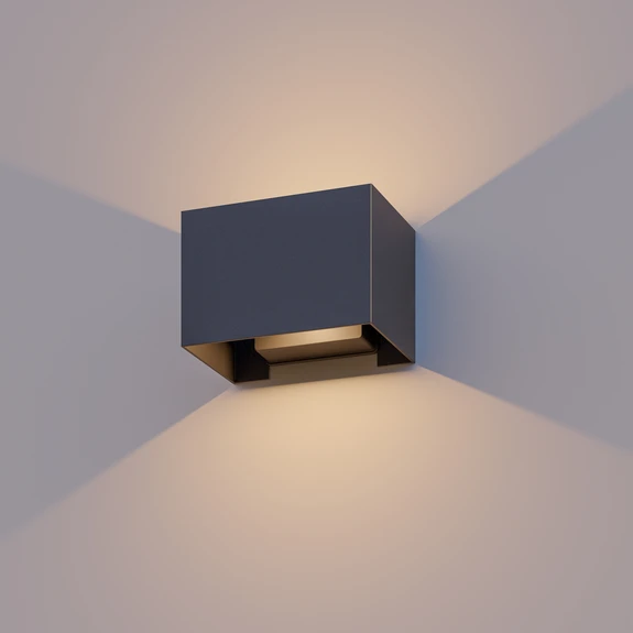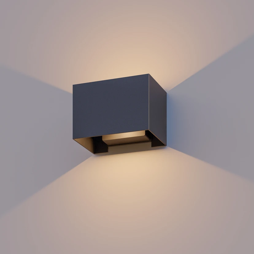 Rechthoekige kubusvormige LED buitenwandlamp, boven- en onderspot Die rechthoekige buitenwandlamp wordt gebruikt voor modieuze accent- en oriëntatieverlichting op gevels en entrees. De behuizing van aluminium en kunststof heeft een eenvoudige, platte kubusvorm en een monochrome afwerking. Beschermd achter kunststof afdekkingen zijn twee warmwitte LED lichtbronnen geïntegreerd; hun licht wordt naar boven en beneden uitgestraald - Beschermingsgraad: IP54 - Inclusief Konstantstrom-Treiber (aan/uit)