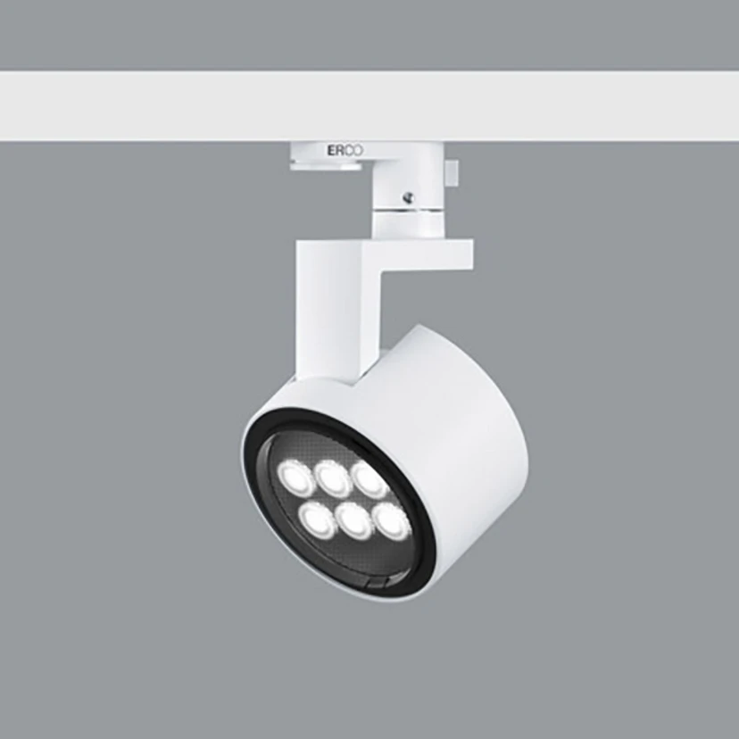 ERCO's Parscan spot met krachtige high-power LED's, gemonteerd op een 230V rail, biedt een hoogwaardige, flexibele binnenverlichting voor het verlichten van verkoop-, presentatie- en tentoonstellingsruimtes met een medium brede lichtverdeling (29° flood) naargelang de situatie. De ronde armatuurkop met kunststof afdekking en de enkelzijdige montagebeugel met interne kabelgeleiding hebben behuizingen van gegoten aluminium met poedercoating. De beugel is bevestigd aan de railadapter (kunststof) zodat deze 360° kan worden gedraaid en de kop tevens 90° kan worden gedraaid. De lichtopbrengstkarakteristiek wordt verkregen door een Spherolit-lens en collimatoroptieken van optisch polymeer.