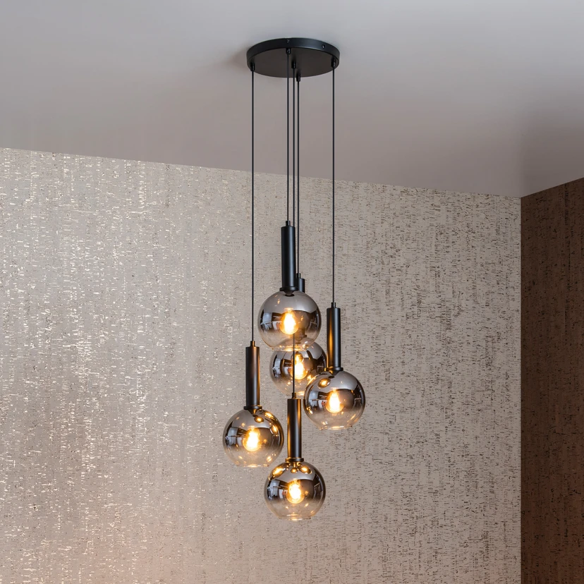 Zwarte Marius hanglamp met vijf lichtbronnenDe vijf lichtbronnen van de Marius hanglamp zijn omgeven door edel fumé glas, dat een aantrekkelijk kleurverloop heeft. Door de rookgrijze tint komt het licht bijzonder goed tot zijn recht en kan het alle kanten op ontsnappen. Bovendien zijn de lampen zichtbaar, waardoor het aan te raden is om te kiezen voor bijzonder decoratieve gloeilampen. De vijf kappen hangen op verschillende hoogtes aan de ronde kap en zorgen voor een individuele look.