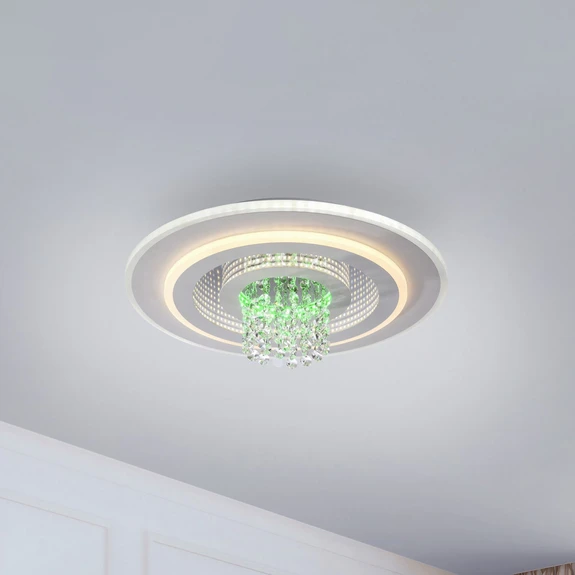 De ronde Tolago LED plafondlamp in stralend wit overtuigt door zijn moderne uitstraling, veelzijdige lichttechniek en een bijzonder designelement in het midden. De combinatie van functionele verlichting, sprankelende kristallen hangers en een fascinerend tunneleffect maakt deze lamp tot een absolute blikvanger in elke woonruimte. Of het nu in de woonkamer, slaapkamer of hal is – de lamp zorgt voor een sfeervolle ambiance met een vleugje glamour en hightech flair. Met een traploos instelbare lichttemperatuur van 3000 tot 6500 Kelvin biedt hij het juiste licht voor elke situatie: warmwit licht voor gezellige uurtjes, universeel wit voor alledaagse situaties of daglicht voor geconcentreerd werken. Bovendien maakt de geïntegreerde RGB-functie gekleurde lichtscenario's mogelijk, die perfect geschikt zijn voor sfeervolle accentverlichting. Dankzij de meegeleverde afstandsbediening kunnen alle lichtbronnen afzonderlijk worden aangestuurd – of het nu gaat om wit licht, RGB of een combinatie van beide. Ook de helderheid is traploos dimbaar via de afstandsbediening. Het midden van de lamp is versierd met kristallen hangers die het licht zachtjes weerkaatsen en elegante glanseffecten creëren. Een ander hoogtepunt is het geïntegreerde tunneleffect, dat zorgt voor een optisch diepte-effect en de ruimte een moderne, bijna magische verlichtingssfeer geeft. Dit effect is vooral indrukwekkend zichtbaar wanneer het RGB-licht is ingeschakeld en geeft de lamp zijn unieke karakter. De geheugenfunctie slaat uw laatst gebruikte instellingen op. De LED plafondlamp Tolago is veel meer dan alleen een lichtbron: het is een stijlvol woonaccessoire met indrukwekkende lichteffecten, veelzijdige bediening en modern comfort. De elegante kristallen versiering, de RGB-kleuren, het tunneleffect in het midden en de eenvoudige bediening met de afstandsbediening maken deze lamp de perfecte keuze voor iedereen die design en functionaliteit in één lamp wil combineren.