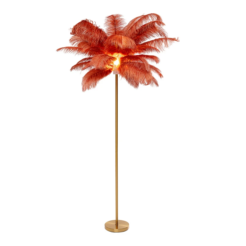 Vloerlamp Feather Palm met kap van struisvogelverenDe vloerlamp Feather Palm is een blikvanger in elke kamer, omdat de fitting tussen echte, uitstekende struisvogelveren zit, die als een palmboom aan de messingkleurige stang zijn bevestigd en bewegen bij het minste zuchtje wind. De lichtbron is in het midden van de veren geplaatst, waardoor de palmboom van binnenuit wordt verlicht en er een heel gezellige sfeer ontstaat. De Feather Palm vloerlamp brengt een wow-effect in elke kamer. Hij is uitgerust met een voetschakelaar in het snoer.