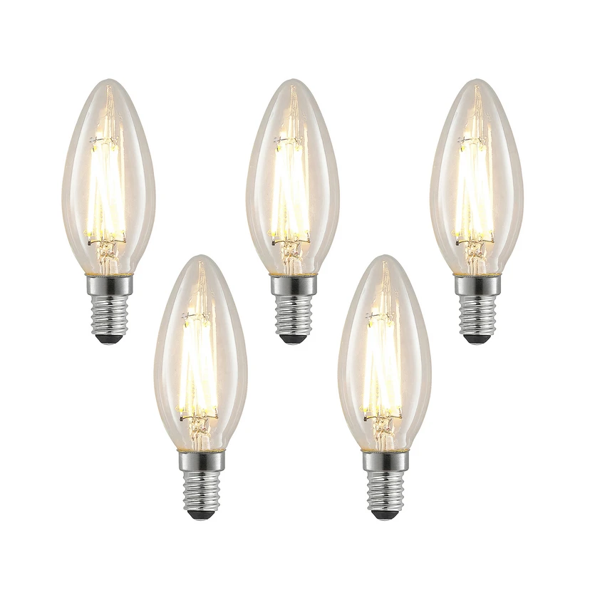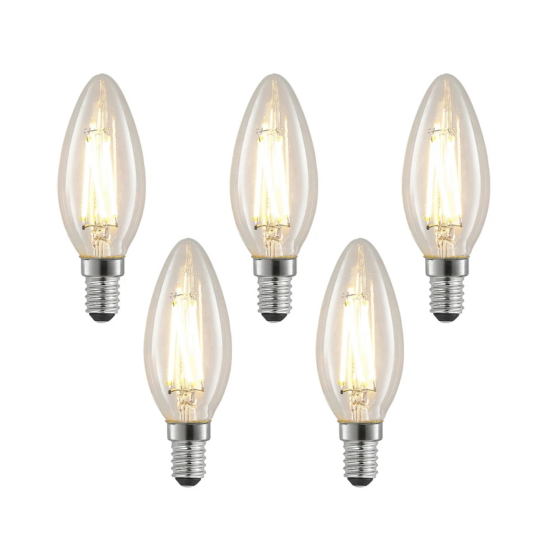 E14 4W LED kaarslamp in filament look, warm wit, dimbaar in een set van 5Deze LED lamp wordt geleverd in een praktische verpakking van 5 en presenteert zich in kaarsvorm met een moderne filament look. De helderheid is vergelijkbaar met een conventionele gloeilamp van 40W, waarbij de ingebouwde LED-technologie een bijzonder laag verbruik heeft. De helderheid van de kaarslamp kan worden geregeld met een externe fase-afsnijdingsdimmer en een ingebouwde wanddimmer.Technische gegevens:- Vergelijkbare waarde gloeilamp 40 W- Multipack