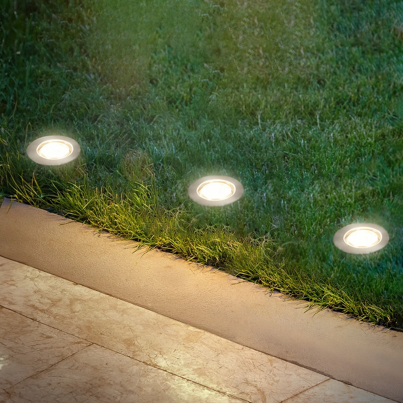 Starterset voor 12 V buitenverlichting - drie ronde LED inbouwspots Ø 4,5 cm van roestvrij staal met stekkervoeding