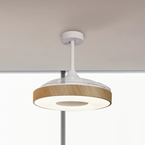 De LED plafondventilator Coin combineert een verfrissende bries met moderne algemene verlichting. De drie vleugels van transparant kunststof zijn alleen uitgeschoven wanneer de ventilator in werking is en verdwijnen boven de ronde behuizing wanneer de ventilator is uitgeschakeld. Deze laatste bevat een krachtige LED lamp, waarvan het licht dimbaar is en waarvan de lichttemperatuur kan worden geregeld en die door een gesatineerde afdekking over een groot oppervlak naar beneden schijnt. De bediening gebeurt met de meegeleverde afstandsbediening.