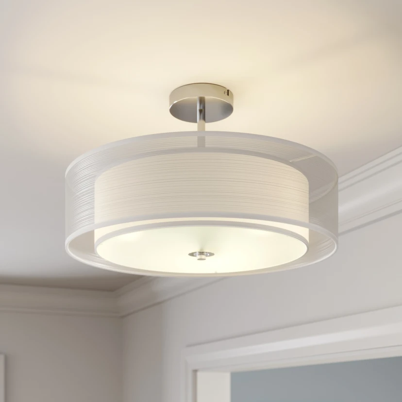 Mooie stoffen plafondlamp Pikka in wit De stoffen plafondlamp Pikka wordt bediend met E27 lampen. De kap van de stoffen plafondlamp, die op een kleine afstand aan het plafond is bevestigd, ziet er zo elegant uit omdat het eigenlijk twee kappen zijn die effectief tot één kap zijn gecombineerd. De buitenste kap is transparant en gemaakt van organza stof, terwijl de binnenste kap gemaakt is van een stevigere stof. Aan de onderkant van de binnenste lampenkap is ook een plaat van wit glas bevestigd, zodat het licht zacht wordt gedimd en een bijzonder gezellig effect heeft.