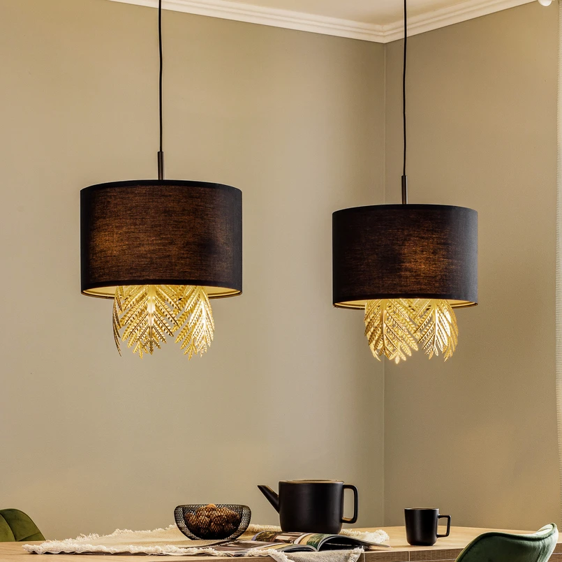 2-lamps hanglamp Malviras met zwarte en gouden stoffen kappen en bladvormige elementen Malviras is ideaal voor gebruik boven een eettafel, waar hij indruk maakt als hanglamp met zijn unieke ontwerp en exclusieve uitstraling. De twee kappen zijn zwart aan de buitenkant en gemaakt van textielmateriaal, terwijl de binnenkant goudkleurig is getint en aan de onderkant wordt aangevuld met filigraan metalen decoraties die lijken op bladeren en ook een gouden oppervlak hebben. Het resultaat is een prachtig kleurcontrast van zwart en goud, dat al enige tijd erg trendy is en niet alleen visueel aantrekkelijk is, maar ook een warm en gezellig lichteffect heeft. In dit geval is de tafel niet alleen een plek om te eten, maar ook een stijlvolle plek voor familie en vrienden om samen te komen, te genieten van een lekkere maaltijd en een gezellig praatje te maken. De Malviras hanglamp creëert een plek waar het goed toeven is.