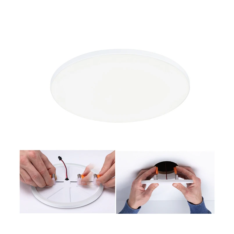 Het ronde LED inbouwpaneel Veluna VariFit Edge past vrijwel naadloos in elk plafond dankzij een frameloos ontwerp en een gesatineerde afdekking. Het deksel verspreidt het licht van de warmwitte LED's gelijkmatig in de kamer. Dankzij beschermingsklasse IP44 kan hij ook in de badkamer of andere vochtige ruimten worden geïnstalleerd en kan de lichtsterkte ook worden aangepast via een externe dimmer (C voor elektrische transformatoren). Voor installatie in verschillende inbouwopeningen is het paneel voorzien van verstelbare klemveren en het zeer platte ontwerp maakt ook installatie in ondiepe spouwdiepten mogelijk.