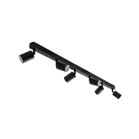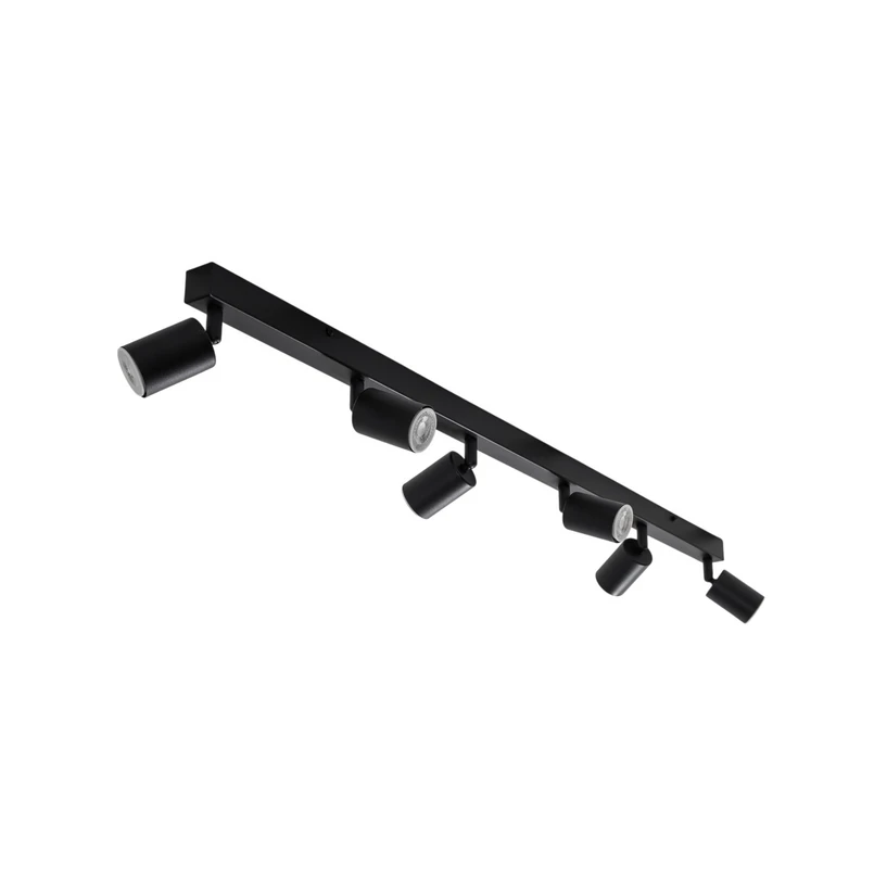 De GU10-plafondspot Top van staal met zwarte afwerking bestaat uit een lange baldakijn en zes cilindrische spotkoppen die in een rij zijn geplaatst. Deze laatste zijn verstelbaar, zodat het licht op het gewenste gebied kan worden gericht.