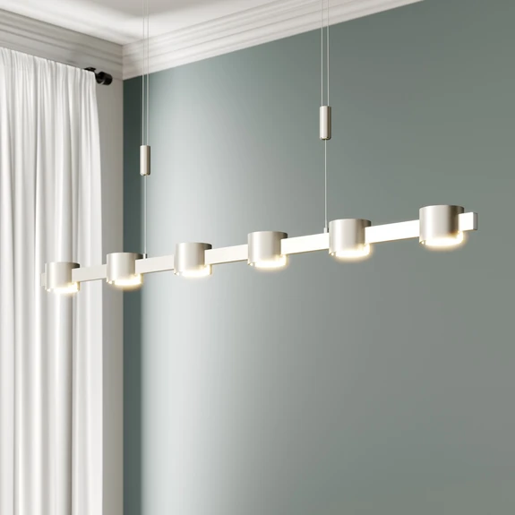 Hoogwaardige LED hanglamp Niro in een elegante nikkelafwerking - dimbaar en in hoogte verstelbaar De LED hanglamp Niro is de perfecte keuze voor iedereen die zich bij het inrichten van zijn ruimte niet wil beperken tot ronde of hoekige vormen. Dit komt omdat ze ronde en hoekige vormen in gelijke mate combineert en zo een grote verscheidenheid aan ontwerpconcepten bedient. De oppervlakteafwerking van de armatuur heeft ook een neutrale uitstraling. De afwerking in mat nikkel is eenvoudig, tijdloos en ziet er altijd zeer elegant uit. Een rechthoekige aluminium buis vormt de basis van het armatuur, die wordt aangevuld door zes ronde buislampen die op regelmatige afstanden aan de buislamp zijn bevestigd. Deze bieden ruimte aan de ingebouwde Citizen LED's, die verantwoordelijk zijn voor het homogene licht dat Niro uitstraalt. Om niet alleen een gecentreerd licht naar beneden te geven, maar het licht ook wat verder in de omgeving te verspreiden, zijn de afzonderlijke lichtlichamen voorzien van zijdelingse openingen waardoor het licht kan ontsnappen. De hele structuur wordt op haar plaats gehouden door twee stalen kabelophangingen met een geïntegreerd mechanisme voor hoogteverstelling dat met één enkele beweging kan worden bediend. Dankzij de dimbaarheid via een leading edge of trailing edge fasedimmer kan de Niro hanglamp worden gebruikt om de meest uiteenlopende verlichtingssferen in de woonkamer te creëren. Terwijl de lamp ideaal is om op maximale helderheid te werken, kan het licht in de avonduren worden gedimd om gezellig samen te zitten met familie of vrienden. Dankzij de uitstekende functionaliteit is Niro een armatuur die niet alleen rekening houdt met het praktische aspect van pure verlichting, maar ook het decoratieve doel dat een lichtbron moet vervullen niet verwaarloost. Daarnaast scoort het zonder twijfel met goede kwaliteit, precieze afwerking en duurzame technologie.