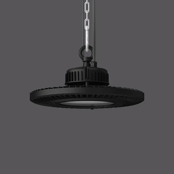 DALI high bay spot Industrial Hall Midi van RZB Deze krachtige LED hal spot is geschikt voor een grote, universeel witte verlichting van commercieel gebruikte ruimtes zoals productie- en opslagruimtes. Hij kan worden afgehangen met een ketting of staalkabel; Industrial Hall Midi heeft hiervoor een ringoog. De aluminium behuizing heeft een poedercoating in neutraal zwart. Das maakt gebruik van krachtige LED hal spots, die worden beschermd achter helder, antireflecterend gehard veiligheidsglas en kunnen worden aangestuurd en geregeld via een Dali interface. - Beschermingsgraad: IP65 - Slagvastheid: IK07 - DALI dimbaar van buitenaf van 10 tot 100 % - Met 1,5 m aansluitkabel - Kan worden gebruikt in omgevingen met geleidend stof dankzij de beperkte oppervlaktetemperatuur in overeenstemming met DIN EN 60598-2-24