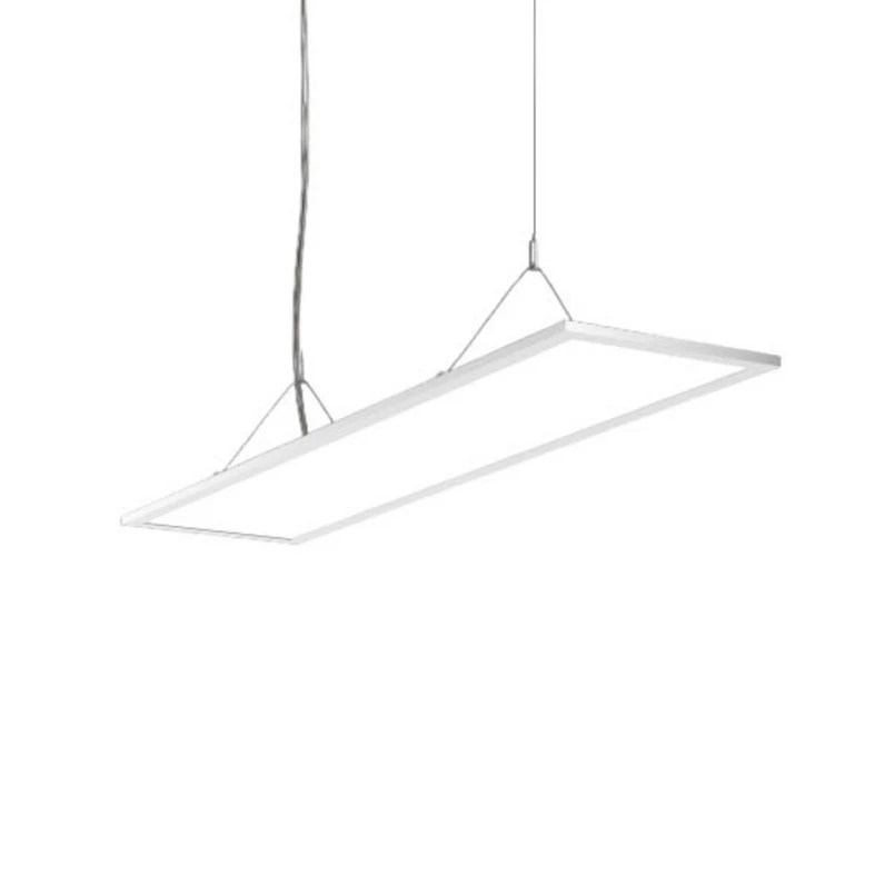 De rechthoekige lamp met een wit gepoedercoat frame van aluminium en een opaalwitte afdekking is zeer plat gehouden en lijkt door de filigrane 2-punts stalen kabelophanging bijna in de ruimte te zweven. De diffusor en lightguide van de lamp zijn gemaakt van niet-vergelende kunststof (PMMA).