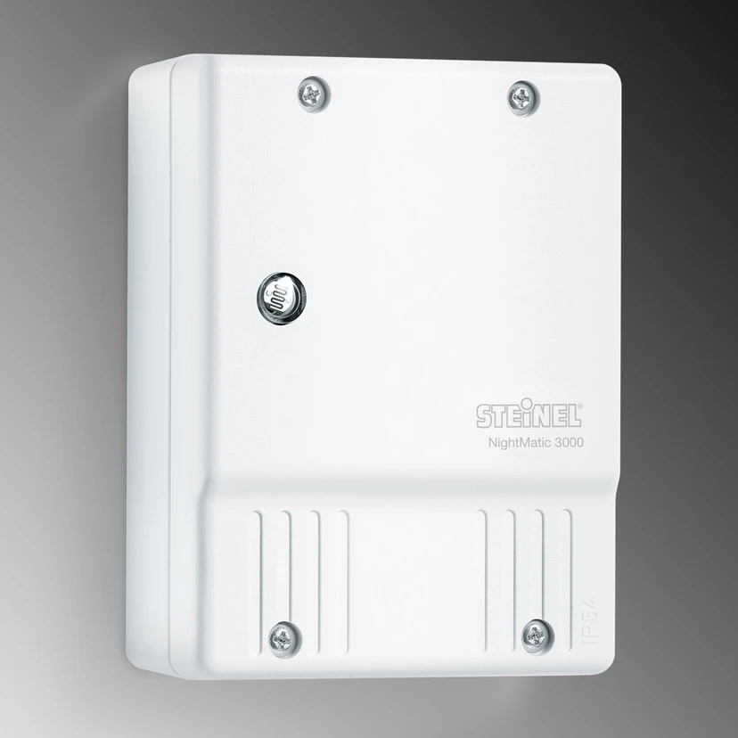 De NightMatic 3000 registreert de omgevingshelderheid en schakelt aangesloten armaturen 's avonds bij het bereiken van de schemeringsdrempel automatisch in en bij zonsopgang weer uit. Met zijn Vario nachtspaarstand helpt hij ook elektriciteit te besparen. Indien gewenst, schakelt het licht 's nachts na een programmeerbare tijd automatisch uit en 's morgens rond 5 uur weer aan - als het dan nog donker is. Hij is uitgerust met zelflichtcompensatie, d.w.z. dat een externe armatuur in de nabijheid de werking ervan niet verstoort.
