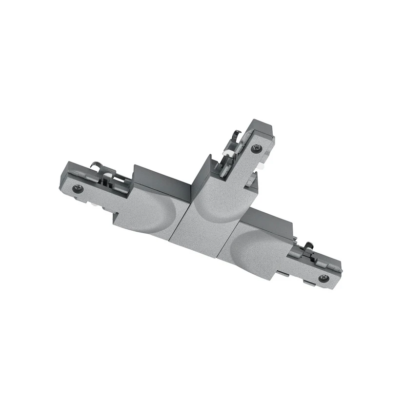 DUOline T-koppeling voor 2-fasig railsysteem met aardleiding buiten links Deze T-koppeling is geschikt voor het DUOline 2-fasig railsysteem. Hiermee kunnen drie rails haaks op elkaar worden aangesloten. Het is de versie met de aardingsgeleider linksbuiten. - Bij het plannen is het essentieel om rekening te houden met de positie van de aardingsgeleider, die continu moet worden aangesloten binnen het systeem