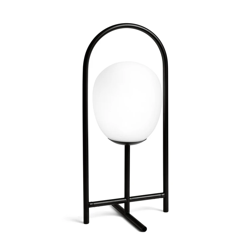 Tafellamp Drop met één lamp, metalen frame en druppelvormige kap van opaalglas De tafellamp Drop is een bijzonder elegante keuze als extra lichtbron voor woonkamers en lounges. Het frame is gemaakt van metalen buizen die in een omgekeerde U-vorm zijn vormgegeven in het buitenste gedeelte en elkaar kruisen in het binnenste gedeelte. Hier draagt één arm de kap van opaalglas, die het licht van de E27 lamp die erin wordt gestoken gelijkmatig breekt. De lampen van de Drop-serie zijn ontworpen door Davide Negri, een Italiaanse architect en ontwerper.