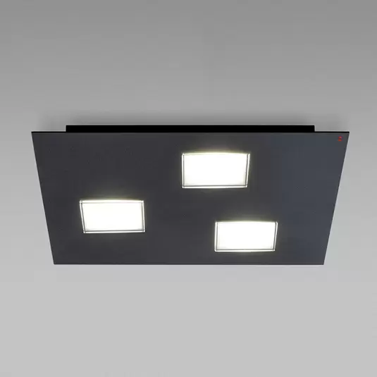 Moderne LED plafondlamp Quarter in zwart met drie lichtuitgangenDe zwarte lakafwerking van de vierkante plaat maakt de plafondlamp Quarter de ideale lichtbron voor de hoofdverlichting van modern ingerichte woonkamers en gangen. Achter de drie vierkante lichtuitgangen, die zijn afgedekt met een diffuser van polycarbonaat, schijnt telkens een LED van 4,5 W. Samen bereiken de drie LED's een lichtstroom van 1.200 lumen. Ze kunnen worden gedimd met een fase-afsnijdings- of fase-afsnijdingsdimmer, zodat ook zachte achtergrondverlichting kan worden bereikt - bijvoorbeeld in de woonkamer om televisie te kijken. Een dimmer is niet inbegrepen.Gemaakt in Italië door de gerenommeerde fabrikant Fabbian Illuminazione, wordt de Quarter LED plafondlamp gekenmerkt door eersteklas kwaliteit en een eenvoudig ontwerp. De producten van deze Italiaanse fabrikant genieten wereldwijd grote populariteit.